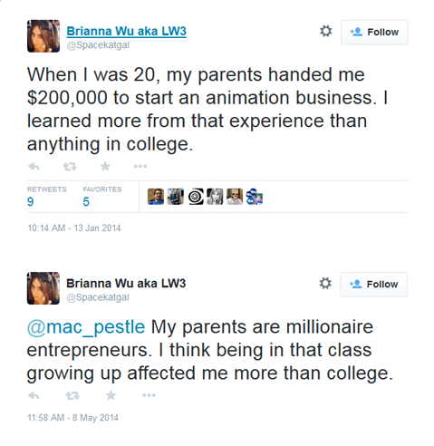 In such an environment, imagine evidence pops up that one of the media clique's new darlings is actually a rather disturbing individual. While profiling herself as a paragon of virtue and a talented progressive activist and game developer, she manipulates and lies her way through her career and relationships. This comes in the form of a warning and a detailed description of emotional abuse, proven with, say, lengthy Facebook citations. The details are quite lurid and salacious, namely infidelity with a set of eponymous Five Guys in the industry, including her boss and a Kotaku reporter. On top of that, she is seen to wear the Emperor's New Clothes, in that her "work" mainly consists of a single choose-your-own-adventure Twine book that would barely pass as a first year student's midterm project. It was praised mainly for its subject—depression—rather than its execution.